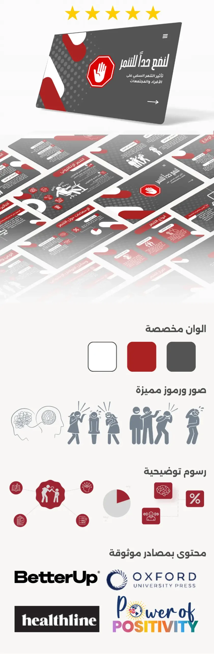 يتناول عرض البوربوينت التقديمي موضوع التنمر بشكل شامل، موضحًا مفهومه وأهميته في المجتمع. يبدأ العرض بمقدمة تعريفية عن التنمر، ثم يستعرض أنواع التنمر المختلفة مثل التنمر الجسدي، اللفظي، الاجتماعي، والإلكتروني. يتناول العرض أسباب التنمر، وكيفية تأثيره السلبي على الأفراد والمجتمع، بما في ذلك الصحة النفسية والعلاقات الاجتماعية. كما يناقش العرض استراتيجيات فعالة لمكافحة التنمر والوقاية منه، سواء في المدارس أو في الأماكن العامة أو عبر الإنترنت. يحتوي العرض على رسوم بيانية وصور توضيحية لتعزيز الفهم وجعل المحتوى أكثر تفاعلية وجاذبية. يمكن استخدام هذا العرض في العروض التقديمية التعليمية والتوعوية والمجتمعية.